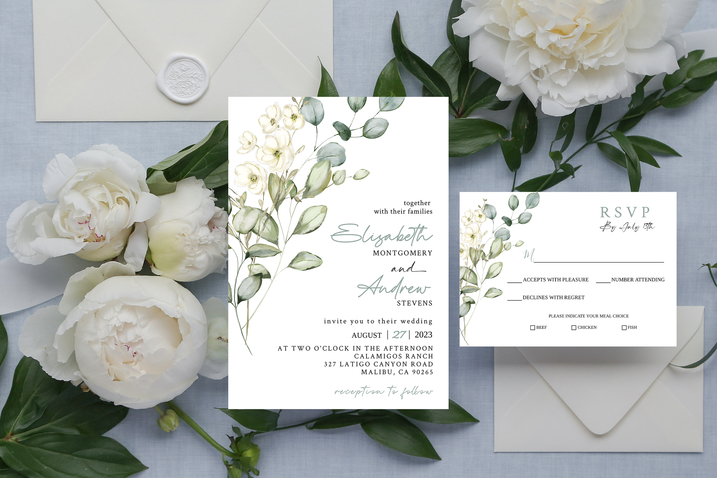 Invitations are printed digitally on 110-130# card stock. Available in Matte and Linen/Textured finish. All invitations, RSVP cards & Save The Dates include free plain white envelopes.